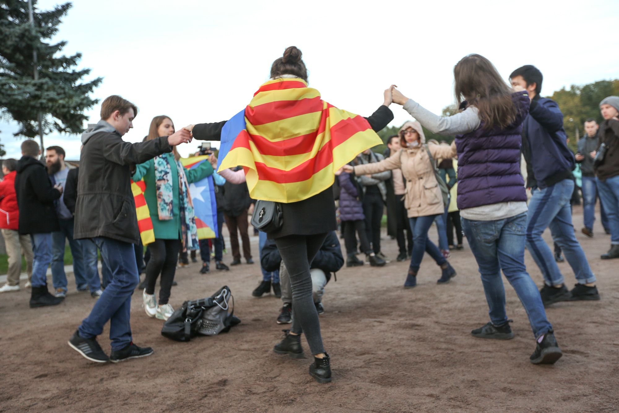 Шесть часов вечера 7 октября. Марсово поле. Шесть человек — четыре девушки и два парня не старше 18 лет на вид — берутся за руки. На плечах у двоих — флаг Каталонии. Играет испанская музыка. Опустив глаза в пол, молодые люди начинают танцевать. Рядом — еще несколько петербуржцев с такими же флагами и рукописными плакатами с лозунгами «Каталония — это свобода!» и «Каталония, мы с вами». Они не танцуют — они стоят и смотрят на окруживших их сторонников Алексея Навального: именно на 18.00 формально была анонсирована акция, приуроченная к дню рождения Владимира Путина, в Петербурге, и к этому моменту здесь собрались порядка тысячи сторонников оппозиционного политика. Большинство из них — не старше тех, кто танцует за независимость Каталонии.