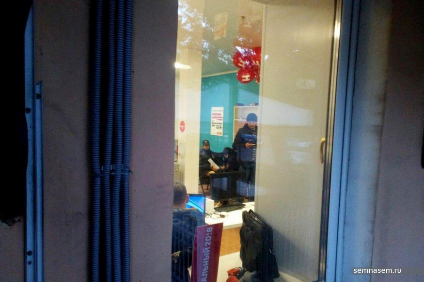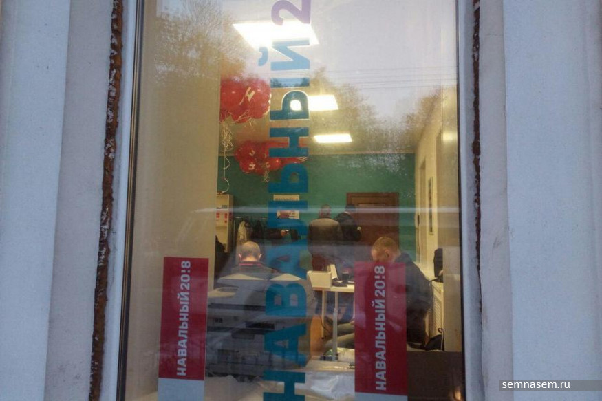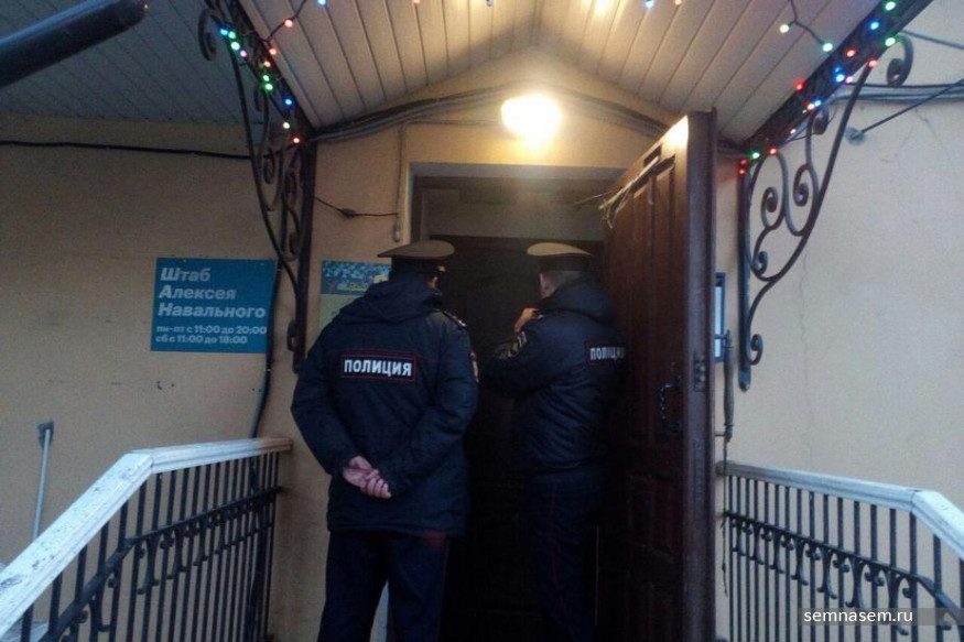 Обыск проводят несколько сотрудников полиции в штатском. В штабе находятся два региональных координатора — Елена Лекиашвили и Александр Смирнов, два волонтера, а также адвокат Сергей Голубенков. В здание никого не пускают. На входе в штаб дежурят двое полицейских, рядом со зданием припарковано несколько полицейских машин и автобус. По предварительным данным, в полицию поступил звонок от некой гражданки Смирновой, в штабе ищут экстремистские материалы.