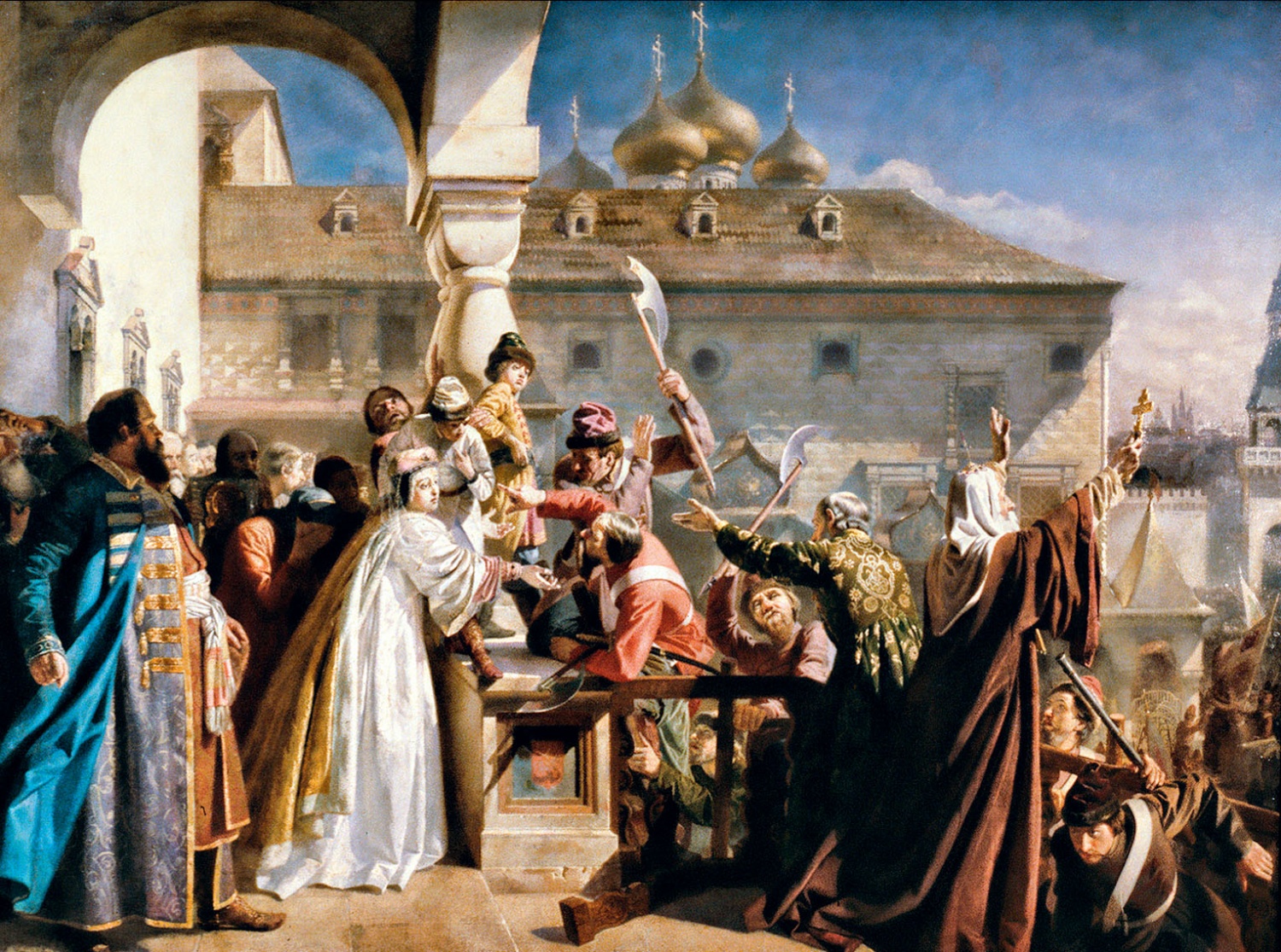 Царь автоматически вставал над схваткой, он лично, его покои и все, кто в этих покоях находился, всегда оставались неприкосновенными. Восставшие могли в 1547 году ворваться в Успенский собор и убить там дядю государя Юрия Глинского. Тем более в 1771 году толпе ничего не стоило расправиться с отцом Амвросием в Донском монастыре. Но царский дворец всегда оставался святая святых. 16-летний Иван Грозный, конечно же, сильно испугался и потом всю жизнь вспоминал, как в его новую резиденцию на Воробьевых горах пожаловал вооруженный люд с требованием казнить его близких родственников. Но толпа и не помышляла убивать его самого. Максимум дерзости — взять государя за пуговицу во время разговора и потом ударить с ним по рукам. Так произошло с Алексеем Михайловичем в 1662 году во время «Медного бунта», но стоило подоспеть стрелецким полкам — и тон в отношениях народа и власти резко изменился.