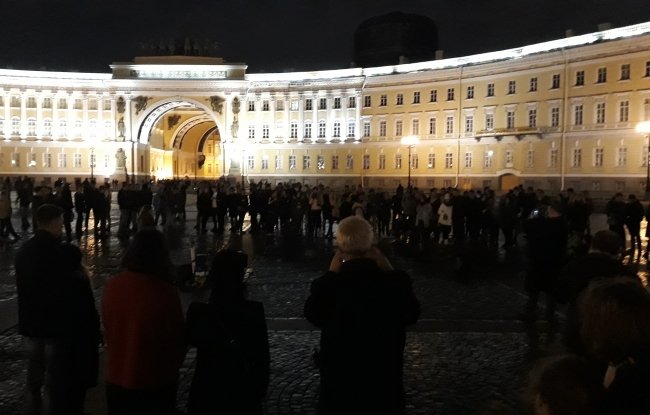 Стояние у «Галереи» продолжалось около двух часов, но количество митингующих таяло. Ближе к полуночи около 300 человек собрались на Дворцовой площади, где в основном спокойно общались и подпевали уличным музыкантам.