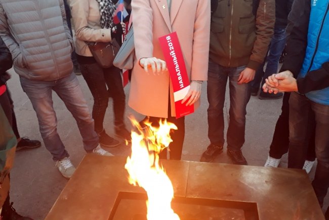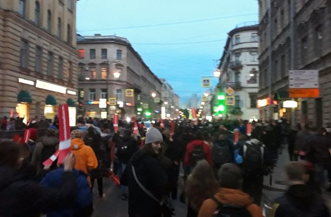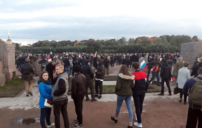 Первые активисты и журналисты начали собираться на Марсовом поле в 17:00 – за час до назначенного времени. Ни лидеров, ни единой повестки у протестующих не было: кто-то просто гулял, грелся у Вечного огня, фотографировался. Наибольший ажиотаж у журналистов вызвал человек в маске Владимира Путина, с удовольствием позировавший фотографам. Несколько студентов вышли с флагами Каталонии. Редкие сотрудники полиции вежливо призывали собравшихся не взбираться на монумент жертвам революции.