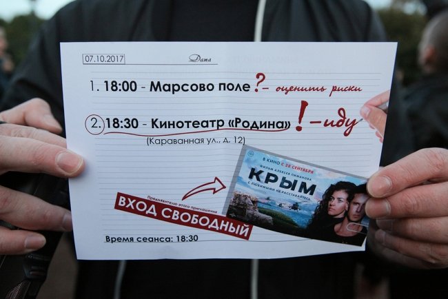 Городские власти нарушили традицию и не стали проводить в пику протестующим на Марсовом поле патриотических фестивалей. Зато спешно организовали работы по благоустройству и покрасили скамейки. В ходе акции Смольный явил еще одно ноу-хау: установленные на площади громкоговорители призывали граждан «не поддаваться на провокации», предлагая взамен посетить бесплатный сеанс фильма «Крым» в кинотеатре «Родина». Толпа откликалась дружным смехом. Позже выяснилось, что это личная инициатива вице-губернатора Петербурга Константина Серова. Листовку с приглашением в кино от его имени получил и корреспондент «Новой».