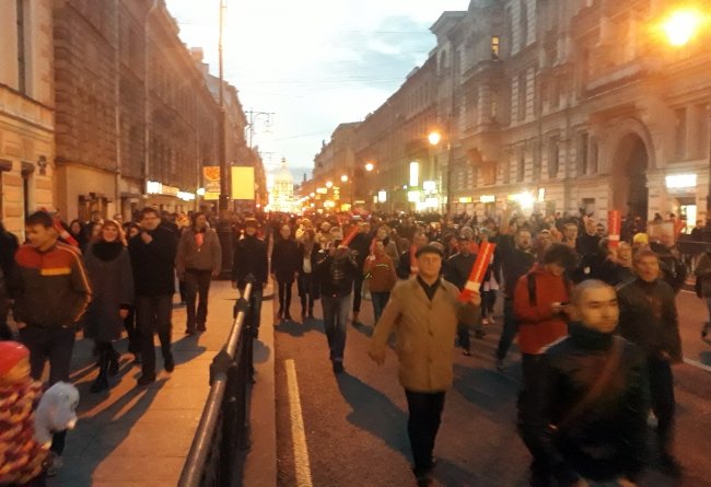 Через полчаса после заявленного времени начала акции сторонники Алексея Навального начали собираться в плотную группу в центре поля. Почти сразу же активисты двинулись в сторону Инженерного замка, увлекая за собой всех, кто находился на Марсовом поле. Автомобильное движение парализовалось. «Мы здесь власть!» – кричали митингующие, полностью завладев улицей Пестеля.