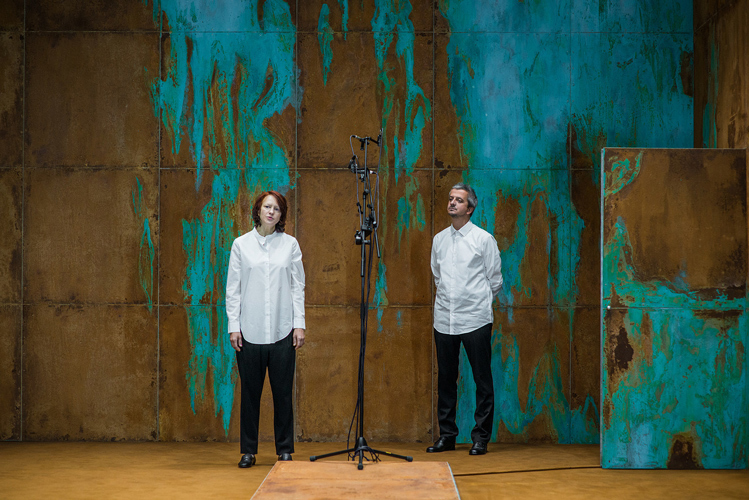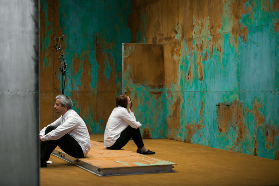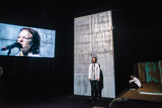 Но с началом действия кашель не прекращается. «Волшебная гора» — самый камерный спектакль Богомолова, в нем заняты всего два артиста: сам режиссер и блистательная прима Электротеатра Елена Морозова. Лариса Ломакина, бессменный сценограф Богомолова, соорудила для них тесную металлическую коробку, изъеденную ржавчиной (как тело — болезнью, может подметить чуткий зритель). Из полутора часов первые минут сорок-пятьдесят в этой коробке почти ничего не происходит: режиссер, обняв колени, сидит в углу, а Морозова кашляет — часто и мучительно. Люди в зале тоже начинают кашлять — скорее, непроизвольно, чем нарочно: запомним это очень важное обстоятельство. Раз в десять-пятнадцать минут актриса прерывает молчание, выходит к авансцене и читает пейзажную лирику русских поэтов — Николая Некрасова, Николая Заболоцкого, Варлама Шаламова. А потом опять начинается пытка кашлем.