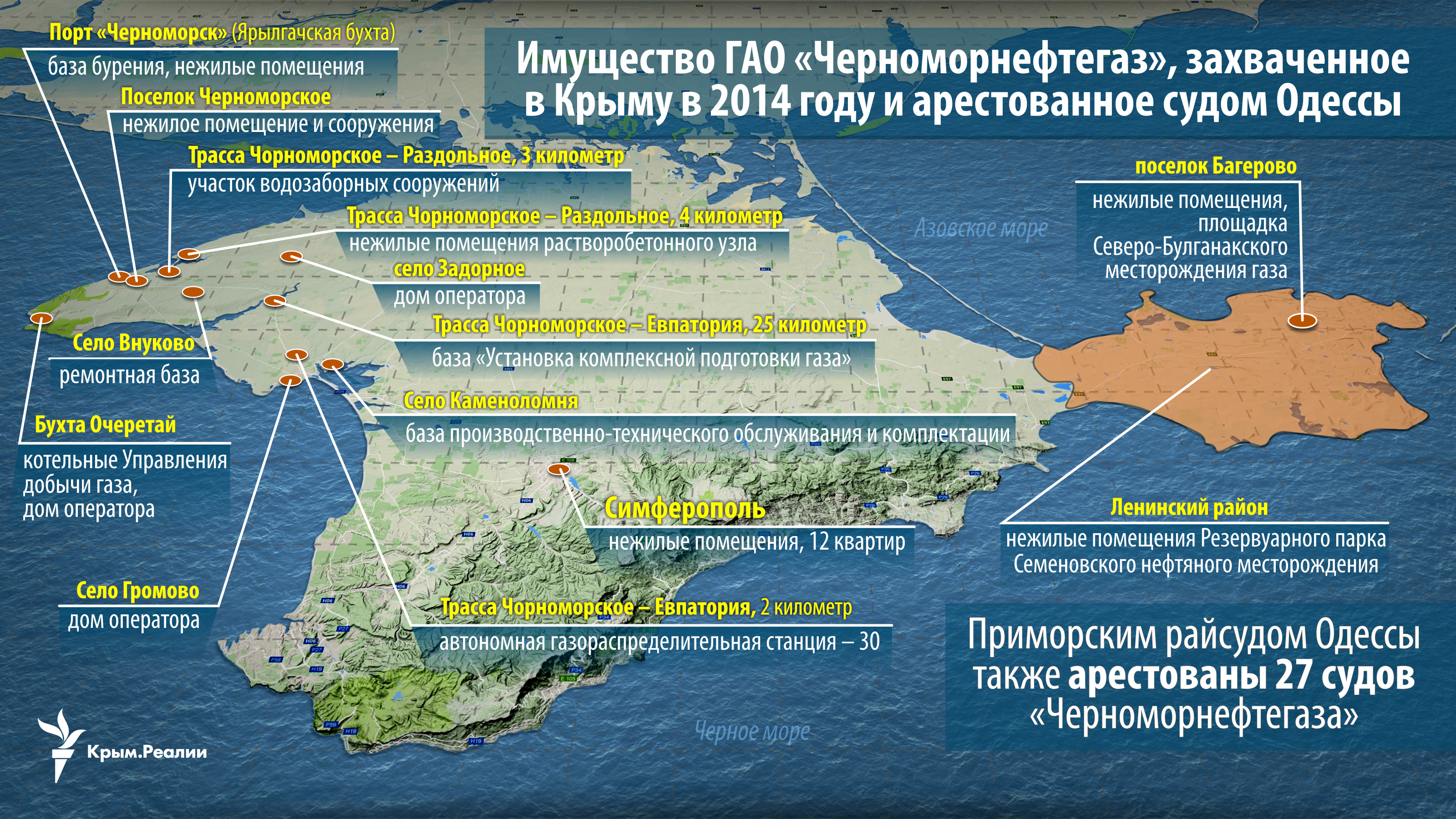 В 2014 году крымские месторождения и буровые установки украинского государственного предприятия «Черноморнефтегаз» захватили российские военные. На его базе создали одноименное предприятие, ресурсы которого распоряжаются нынешние власти полуострова. Ежегодно крымский «Черноморнефтегаз» тратит миллионы рублей на свои нужды. Крым.Реалии нашли доказательства того, что украинские буровые вышки и другое «национализированное» имущество крымские власти используют незаконно.