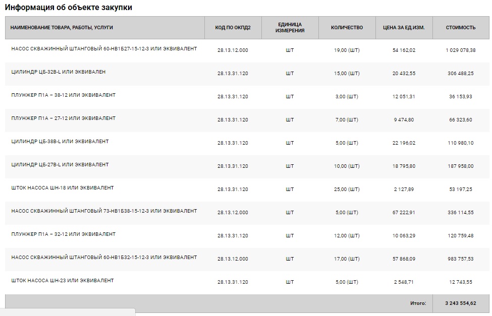 В октябре предприятие собирается закупить 3 глубинных штанговых насоса для добычи нефти из скважин, а также запчасти к ним на сумму 3 миллиона рублей. В тендерной документации указано, что это насосы из углеродистой и низколегированной стали с твердохромированным покрытием внутренней поверхности.
