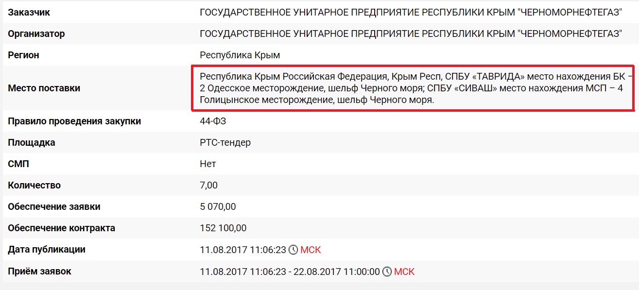 Как стало известно Крым.Реалии, в августе ГУП «Черноморнефтегаз» закупило услуги по техническому диагностированию семи кранов, установленных на самоподъемных плавучих буровых установках «Таврида» и «Сиваш». Они находятся на Одесском и Голицынском месторождениях газа и нефти на шельфе Черного моря.