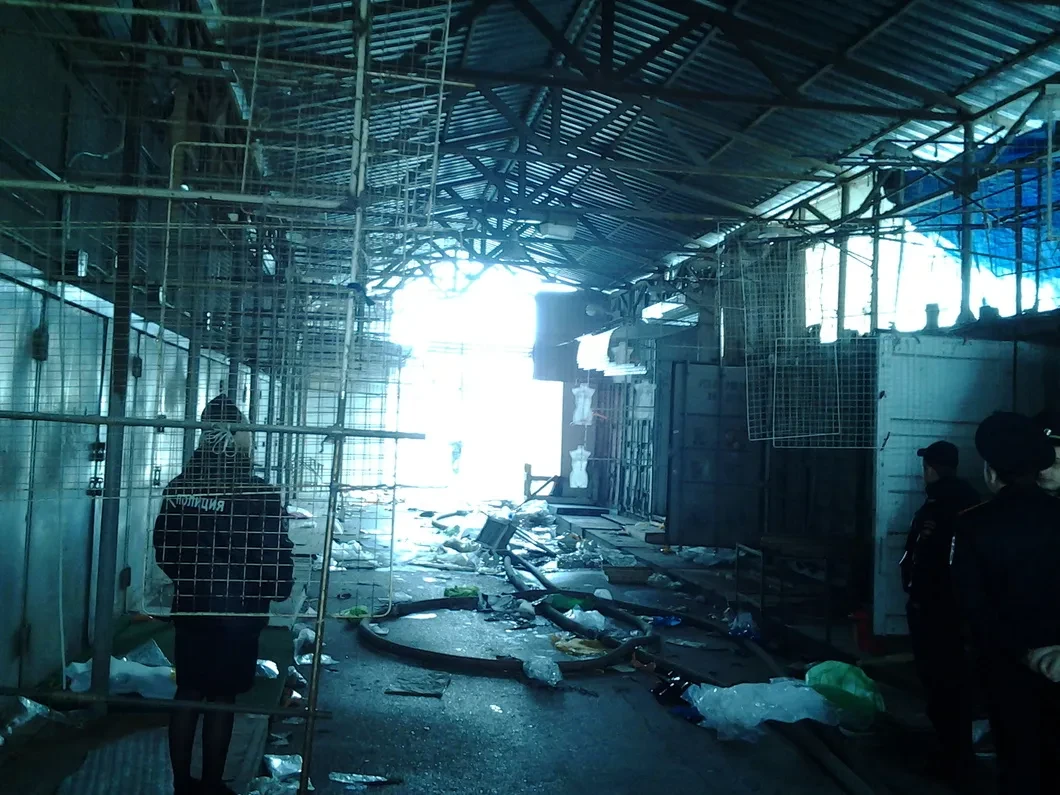 Утром в понедельник тушение пожара продолжалось, вода подавалась из жилого сектора, который находится в 150 метрах от первых торговых рядов.
