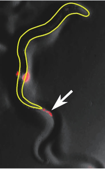 В центре чашки Петри с плотной питательной средой для роста бактерий исследователи вырастили небольшой круглый газончик кишечной палочки Escherichia coli. Рядом с этим газончиком поместили одну нематоду стандартного лабораторного штамма N2. Со временем в чашке стали появляться, а затем исчезать новые колонии кишечной палочки. Поскольку сами бактерии лишены подвижности, исследователи заключили, что их переносит червь. Для удобства наблюдения клетки E. coli пометили зеленым флуоресцирующим белком, и оказалось, что черви способствуют формированию новых колоний двумя способами.