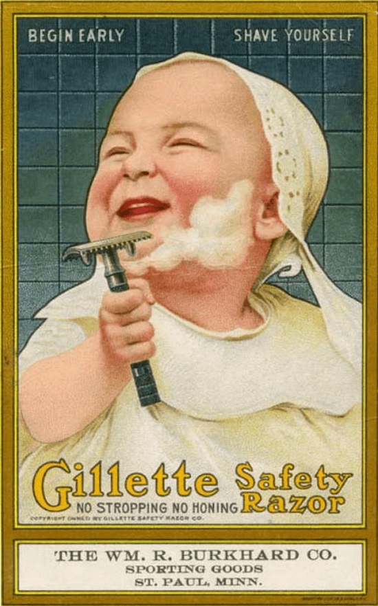 А это вот совсем старая реклама, ей больше ста лет. Сейчас так легко в использовать детёнышей в рекламе запрещено, у нас есть ограничения. Но в целом baby-shape — это беспроигрышный вариант.