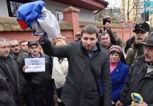 В середине июня 2014 года во время митинга у российского посольства в Киеве протестующие забросали здание камнями и бутылками, а также использовали дымовые шашки и взрывпакеты. С флагштока демонстранты сорвали российский флаг и сожгли его.