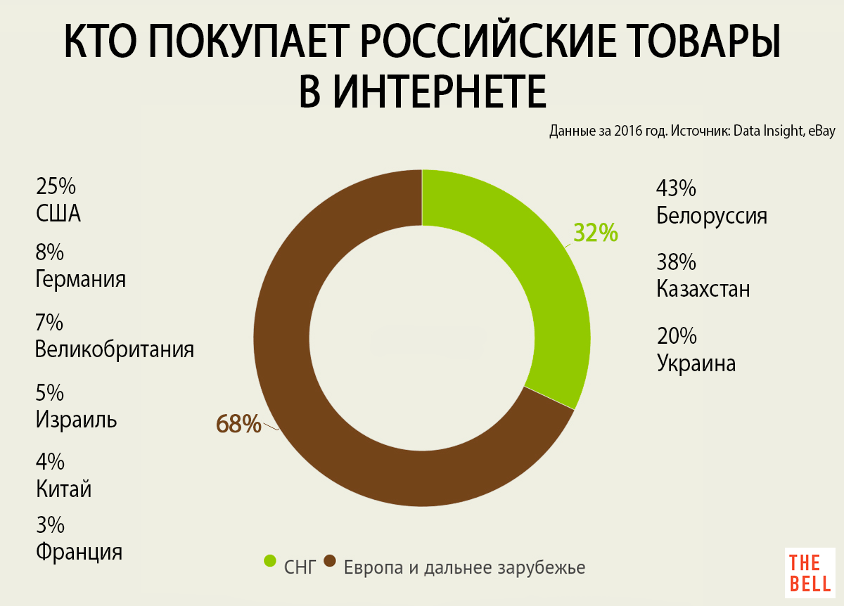Объем российского экспорта через интернет в 2017 году составит $490 млн, говорится в опубликованном сегодня исследовании компании Data Insight и интернет-маркета eBay. В 2016 году эта цифра составила $430 млн — в 700 раз меньше, чем по оценке правительства, приведенной в паспорте госпроекта «Электронная торговля», отмечает РБК. Как утверждают исследователи, большинство российского онлайн-экспорта приходится на Европу и Дальнее зарубежье: