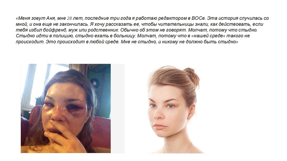 Автор: с сайта w-o-s.ru «Теперь это твое истинное лицо, Анечка» А.Р.: Анна Жавнерович подробно написала о том, как наша правовая система ее игнорировала, как в полиции отказывались не то, чтобы помогать, а просто даже принимать заявление. Но самым страшным для меня была реакция людей на рассказ чудовищно избитой девушки — многие начали винить в произошедшем ее. Мол, наверняка, сама спровоцировала. В общем, все это очень трудно психологически. И далеко не все могут с этим справиться. Такое произойти может с каждой, и если это произойдет, то за помощью обращаться некуда. Поэтому и пришло желание заняться этой проблемой — так появился проект «Насилию.Нет» в виде сайта, мобильного приложения и прочих полезных опций.