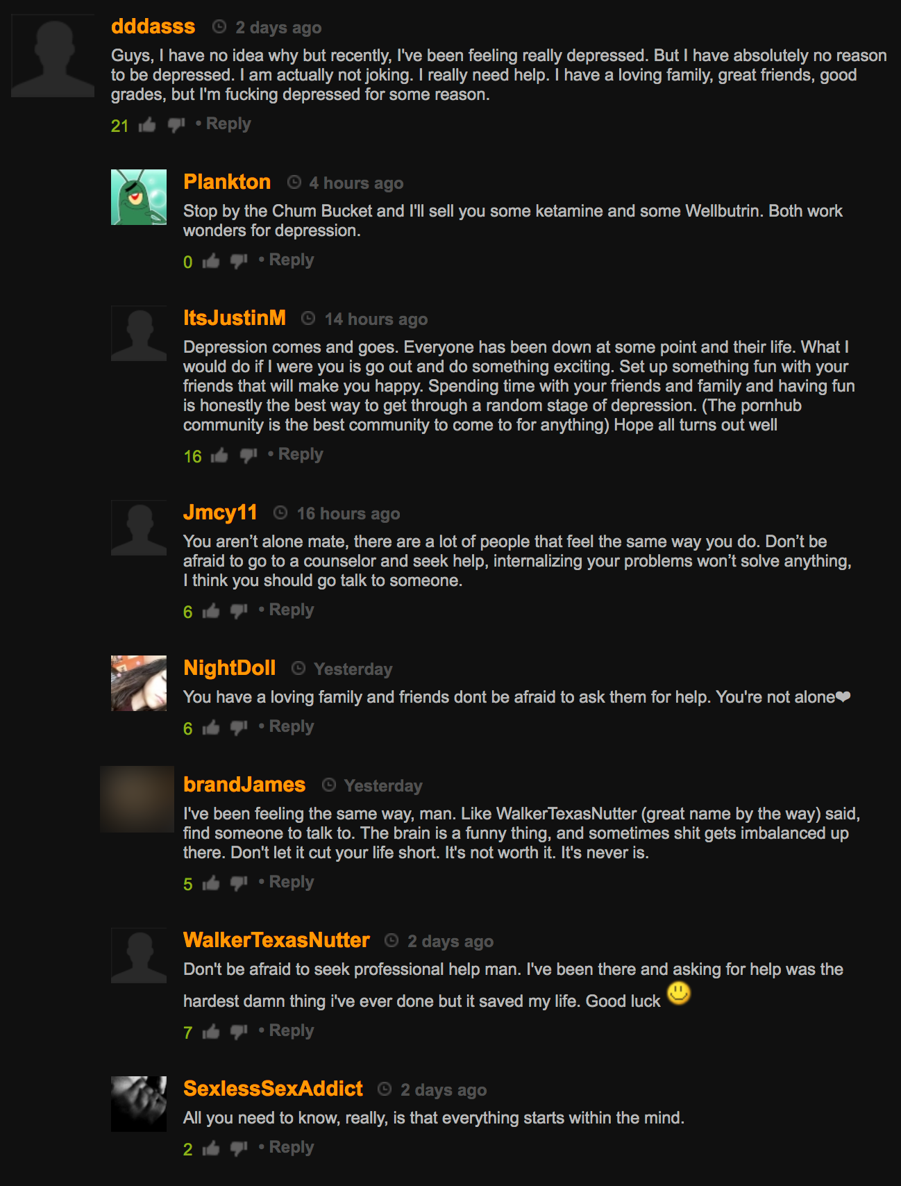 «Ты не одинок, чувак». Пользователь PornHub пожаловался на депрессию в комментариях к видео, и его поддержали