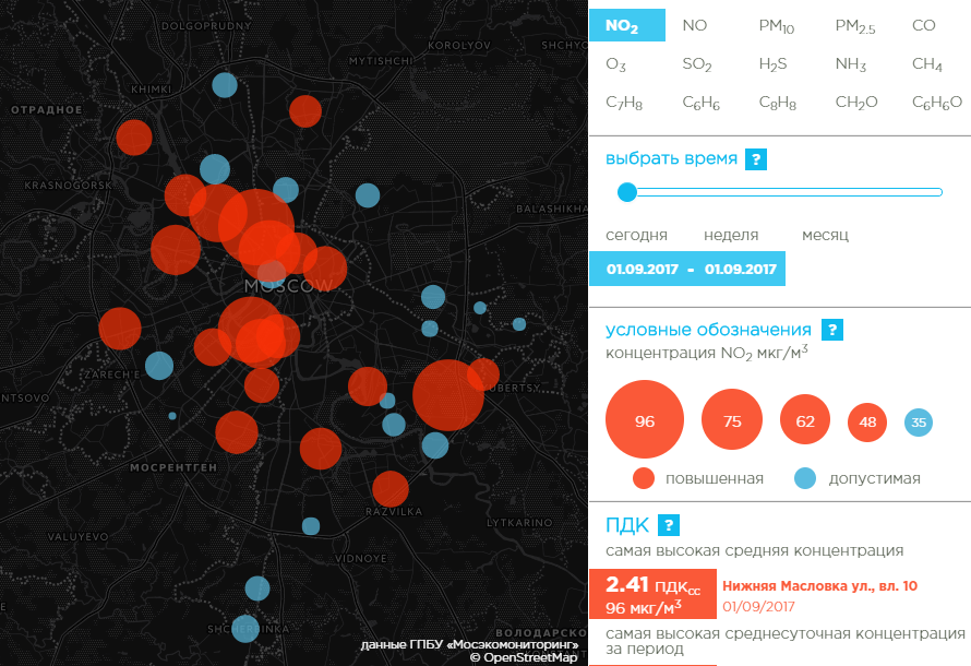 Карта загрязнения воздуха в Москве с 1 сентября В ответ на это в столичной мэрии заявили, что Москва — лидер по реализации природоохранных мероприятий и властям удалось добиться снижения выбросов от автотранспорта с 1 миллиона тонн до 880 тысяч тонн в год.