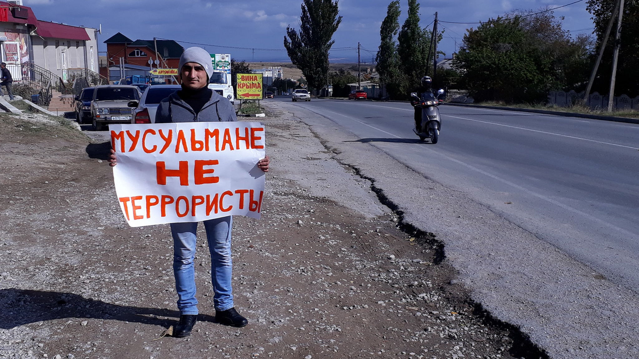 Региональный представитель «Крымской солидарности» Алимдар опубликовал в Фейсбуке фотографии одичных пикетов. Активисты также вышли с плакатами «Поиск террористов – безнадежное дело», «Мусульмане не террористы» и другими.