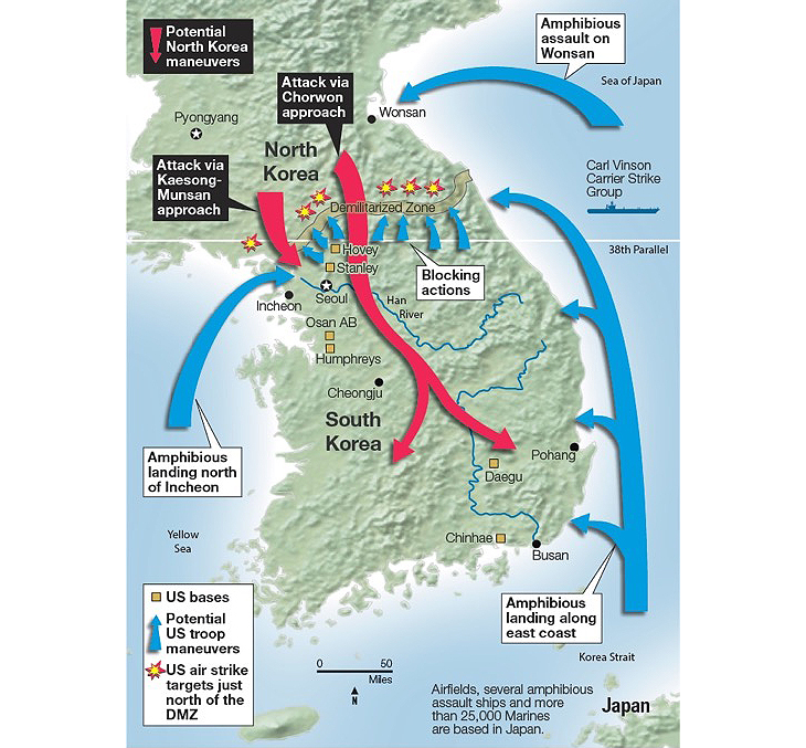 Карта, отображающая возможные сценарии боевых действий на Корейском полуострове.Синие стрелки — места высадки морского десанта США и направления удара сухопутных войск, красные стрелки — вероятные направления ударов армии Северной Кореи, места взрывов — цели бомбардировок ВВС США. Источник: The Military Times**
