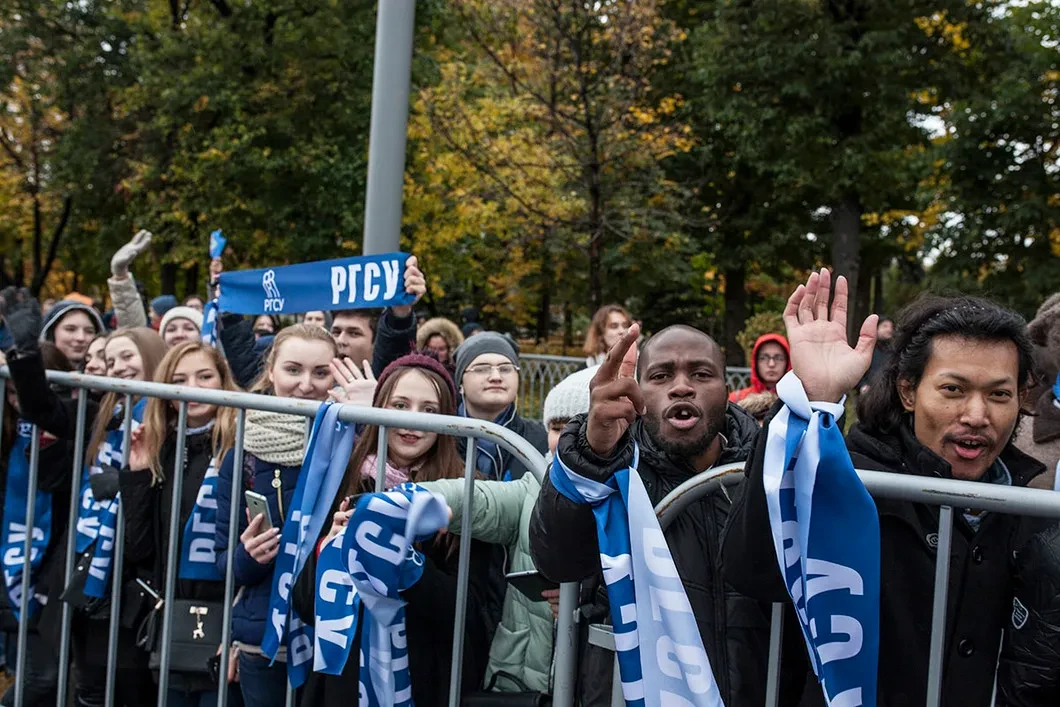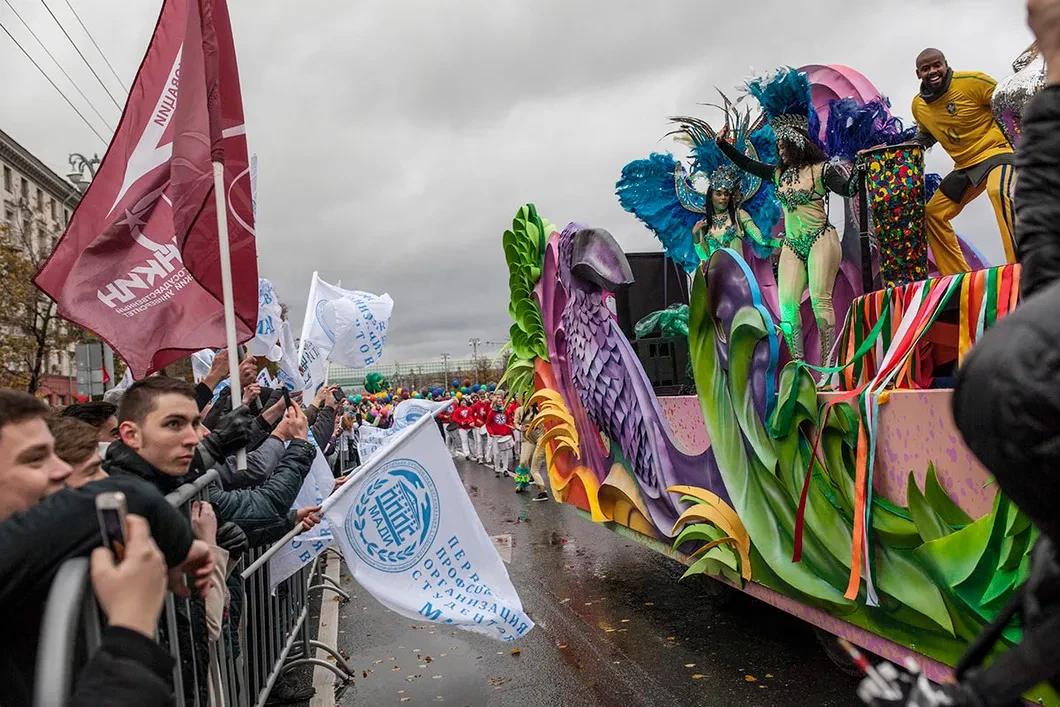 Зрители карнавального шествия в рамках XIX Всемирного фестиваля молодежи приветствуют бразильскую колонну. Фото: Влад Докшин / «Новая газета»