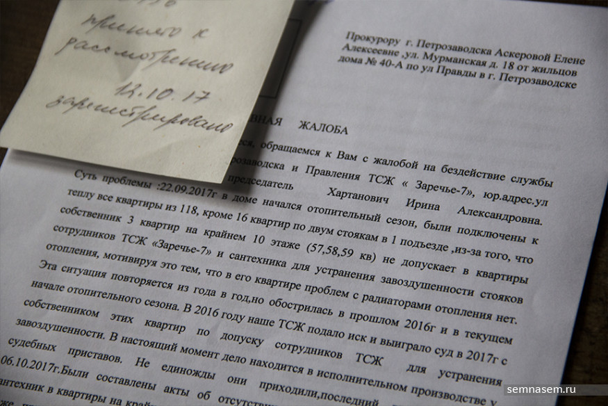 В ответ Шмаеник написал претензию в прокуратуру и подал встречный иск в суд на ТСЖ за то, что те не дают тепло в их квартиру. Судья Петрозаводского горсуда Наталья Малова 27 января 2017 года действительно обязала ТСЖ дать отопление в квартиру №57.