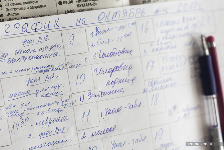 Из-за отсутствия отопления страдает, например, бывший учитель Галина Биттенбиндер. Пожилая женщина живет одна. Чтобы ничего не забыть в свои 75 лет, она делает календарь на каждый месяц. В графике на октябрь за 9 и 10 числа у нее была запланирована голодовка — пенсионерка хотела добиться включения тепла. В ночь на 11 октября ей стало плохо, пришлось вызвать Скорую помощь. После этого инцидента родственники запретили Галине голодать. Ее соседка с пятого этажа Галина Кирилюк тоже жалуется на здоровье — она простыла, несмотря на то, что у нее работает обогреватель. На холодном полу все равно мерзнут ноги, говорит женщина.