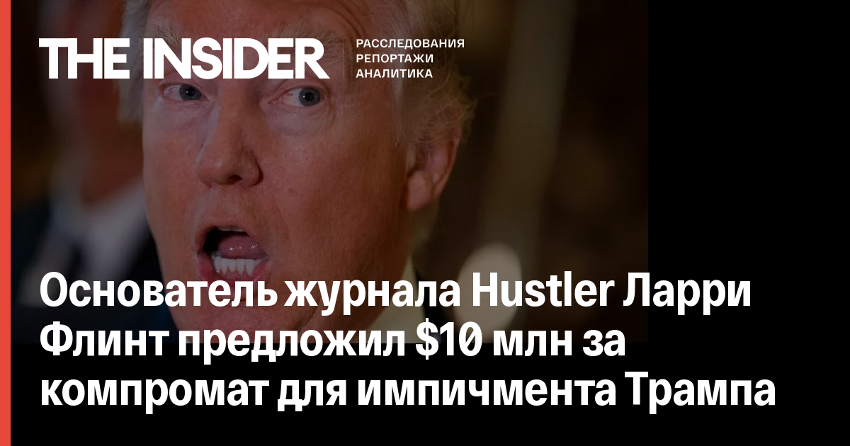 Основатель журнала Hustler Ларри Флинт предложил 10 миллионов долларов за компрометирующую информацию, которая позволит привести к импичменту президента США Дональда Трампа. Объявление об этом он разместил в воскресном номере газеты The Washington Post.