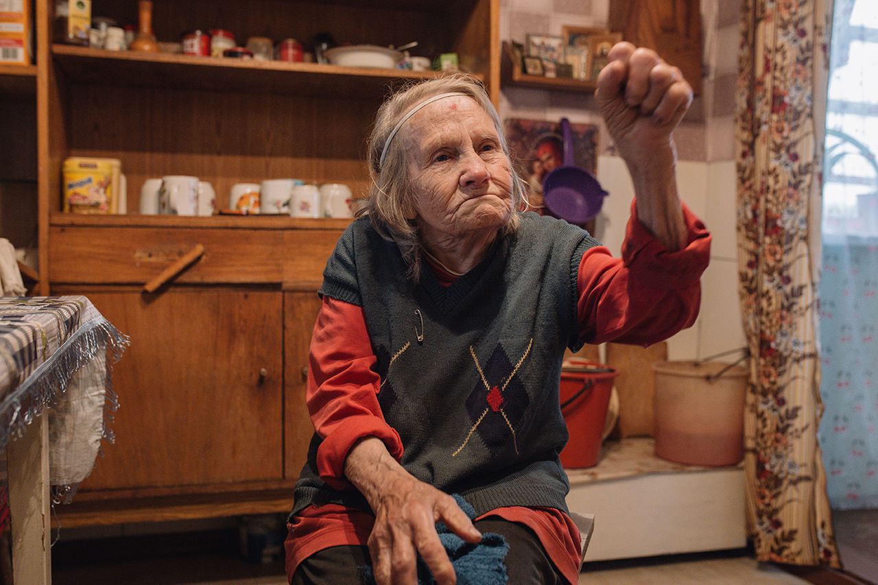 Пока участковый Николай Хворостенко был жив, жена во всём ему помогала. Однажды вместе с мужем отправилась посреди ночи тушить пожар в детском саду — тогда ей в голову отлетела горящая деревяшка и выжгла клок волос. Теперь, когда Николая уже нет в живых, она живёт одна, работает на железной дороге и на выходных закатывает банки с компотом.