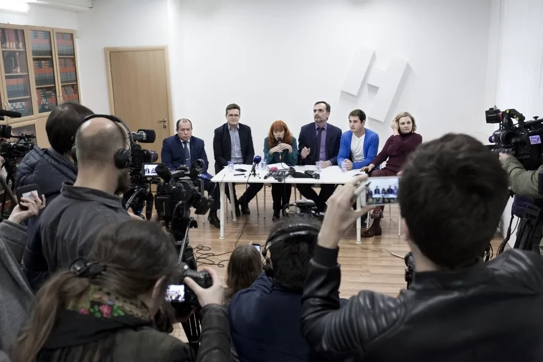 Елена Милашина («Новая газета»), Татьяна Локшина (московское бюро Human Rights Watch), Максим Лапунов (на переднем плане), рядом с ним Игорь Каляпин (Комитет против пыток), позади — адвокат Владимир Смирнов, крайний справа — Игорь Кочетков (председатель «ЛГБТ-сети») в редакции «Новой газеты». Фото: Анна Артемьева / «Новая газета»