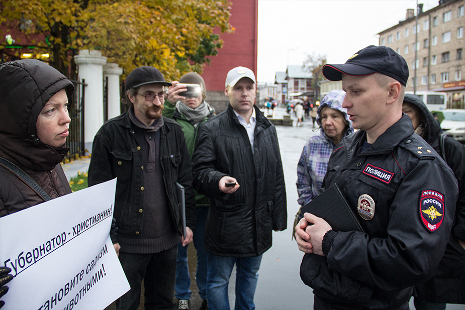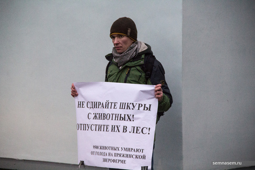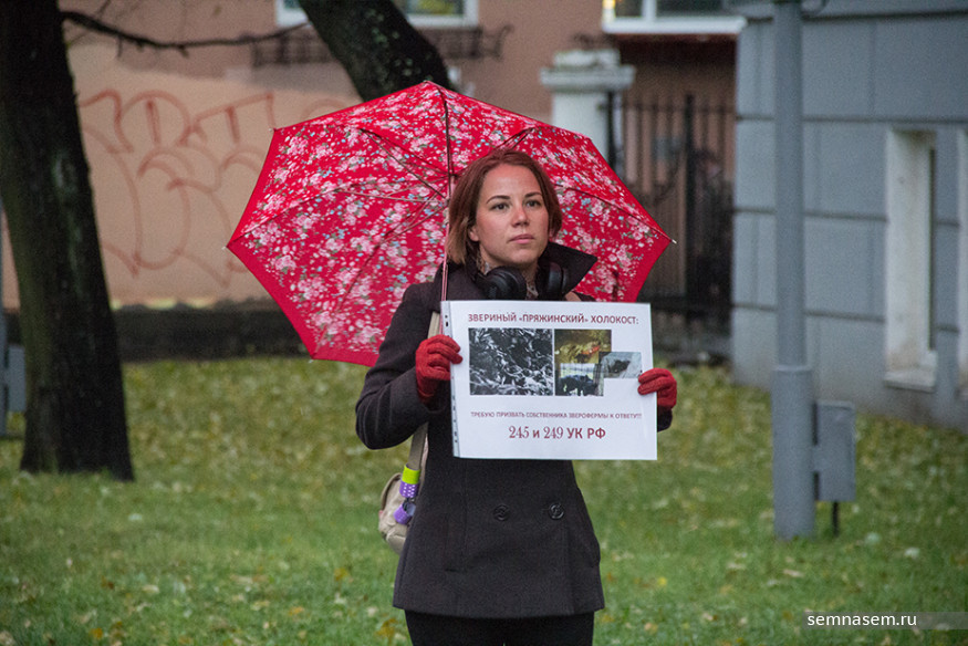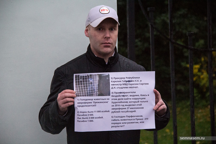 Карельские зоозащитники и общественники вышли с одиночными пикетами к зданию правительства в знак протеста против гибели животных от голода на пряжинской звероферме. В руках они держали плакаты с надписями: «Остановить садизм над животными», «Не сдирать шкуры с животных и отпустить их в лес» и другими. Участники пикетов 16 октября также зажгли свечи — по их словам, в память о погибших норках и лисах.