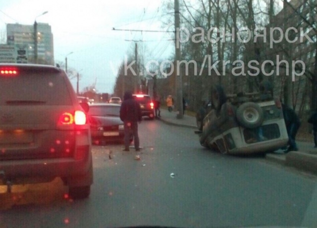 В Красноярске от удара легковой автомобиль перевернулся на крышу