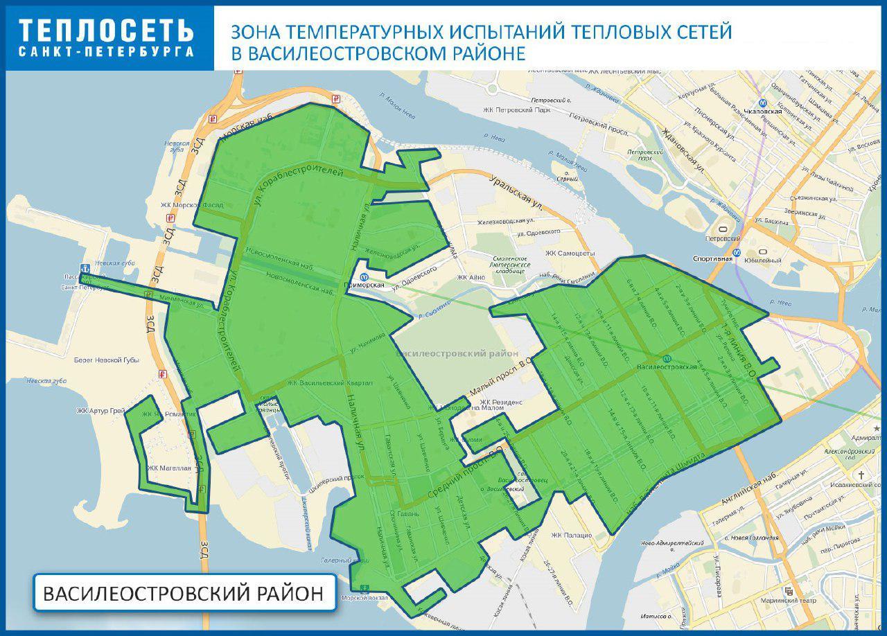 Работы будут проходить на Большой проспекте, 24-25 линиях, 20-21 линиях, 18-19 линиях, 14-15 линиях, 10-11 линиях, 6-7 линиях, 2-3 линиях, Среднем проспекте — от 24-25 линии до Тучкова переулка, Малом проспекте — от 24-25 линий до 2-3 линий. Отключения затронут большую часть Василеостровского района. Отопление будет работать в штатном режиме.