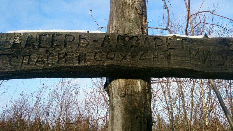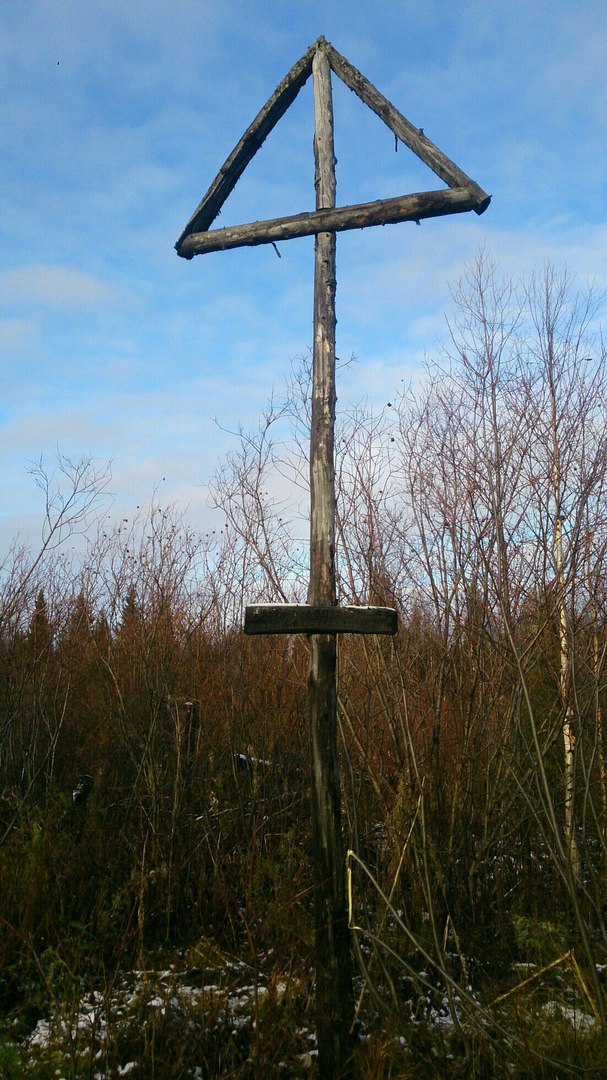 Под фото вот такой текст: "Памятный деревянный крест на кладбище лагеря-лазарета САНО №2 Печжелдорлага в районе станции Мишаяг, в 10 километрах от Печоры. Установлен в 2001 году печорским и сыктывкарским поисковыми отрядами под руководством Татьяны Афанасьевой и Игоря Сажина.
