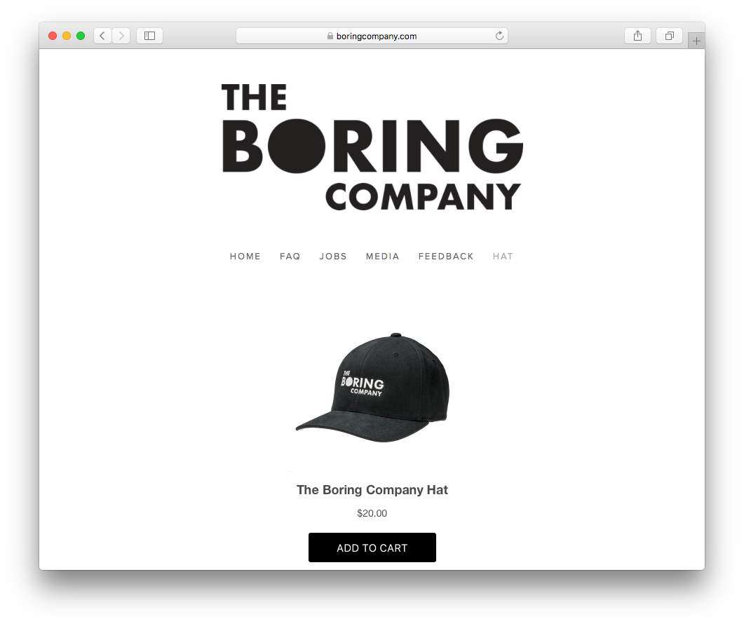 Основатель SpaceX и Tesla Илон Маск 18 октября дал в своем твиттере ссылку на магазин компании The Boring Company, которую он создал для рытья автомобильных тоннелей под городскими улицами. В магазине продается черная кепка с названием компании. «Самая скучная кепка в мире», как назвал ее Маск, стоит 20 долларов.