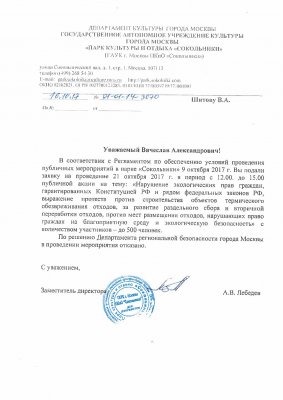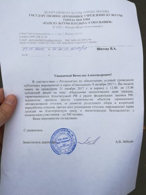 13 октября активисты получили официальный ответ от администрации парка, в котором было сказано, что публичная акция согласована. Однако, через три дня организаторам пришло новое письмо, где было сказано, что по решению Департамента региональной безопасности города Москвы в мероприятии отказано.