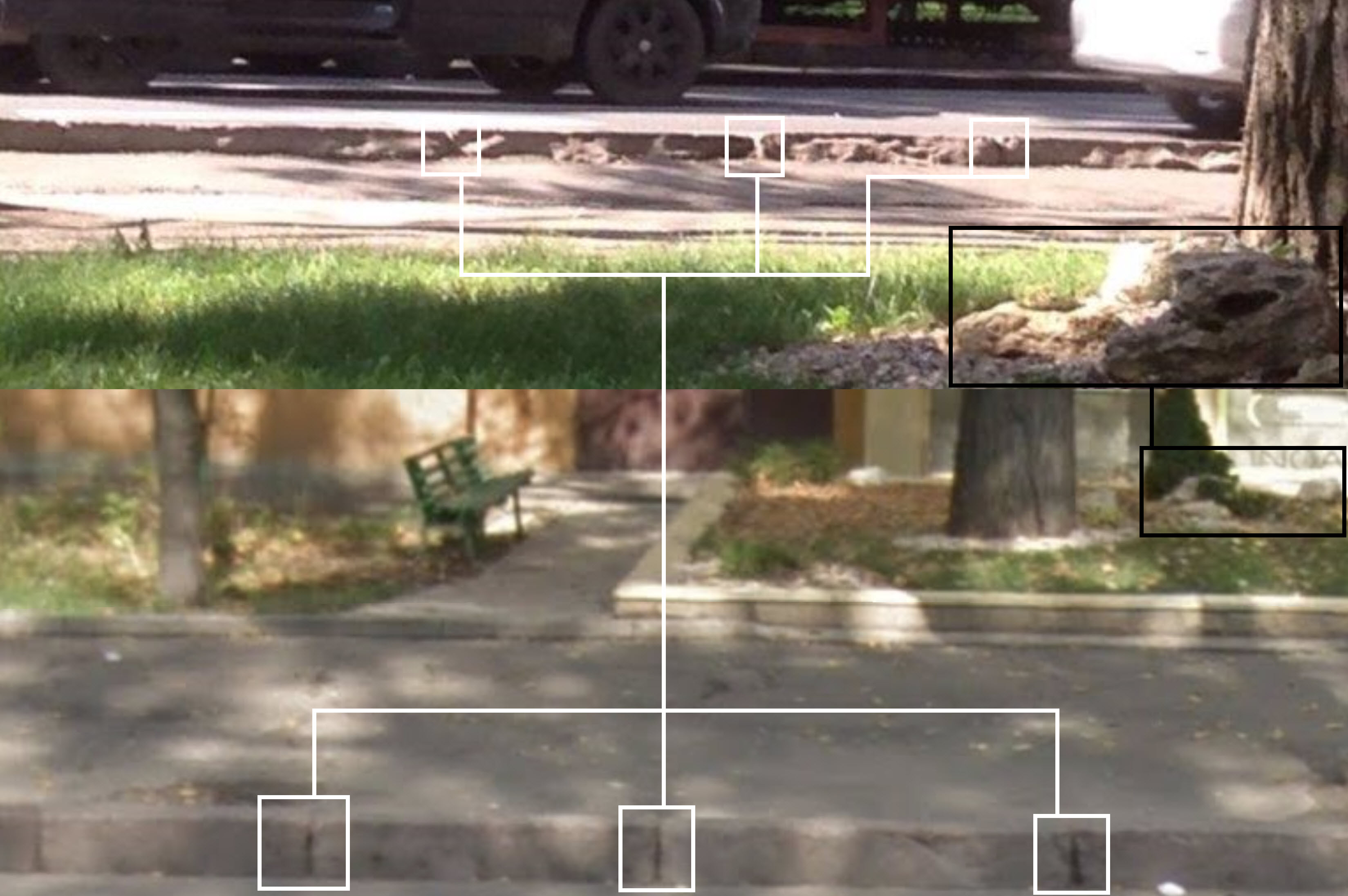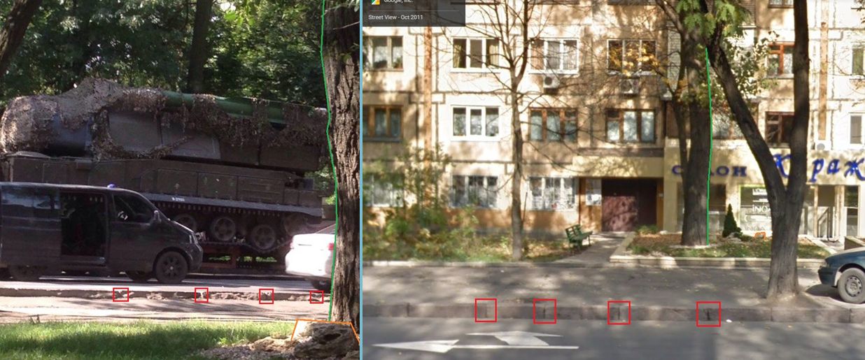 Исследователи изучили все доступные в интернете панорамные снимки проспекта Ильича в Донецке (на сервисах "Яндекс.Панорамы" и Google Street View) и пришли к выводу, что опубликованная международной следственной группой фотография сделана напротив дома 78. В установлении истины помогли мельчайшие детали. Например, расположение и едва заметные промежутки между бордюрными камнями: