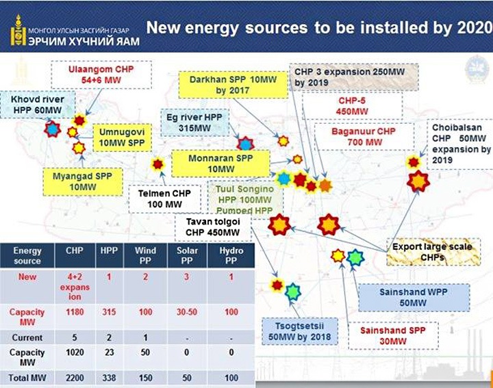 В январе в Монголии заработала крупная СЭС мощностью 10 МВт в Дархане, которую построила монгольская компания Solar Power Int. (проектирование), совместно с японскими Sharp и Shigemitsu Shoji. Еще один ветряной проект мощностью 50 МВт должен заработать в следующем году в Сайншанде. По оценкам «Рек без границ», в октябре 2017 года структура энергогенерации Монголии была следующей: 1020 МВт – объем производства традиционных угольных ТЭЦ, 28 МВт – выпуск малых ГЭС, не менее 15 МВт – СЭС, 105 МВт – ВЭС. Около 25 МВт – на дизельных и других мелких установках.