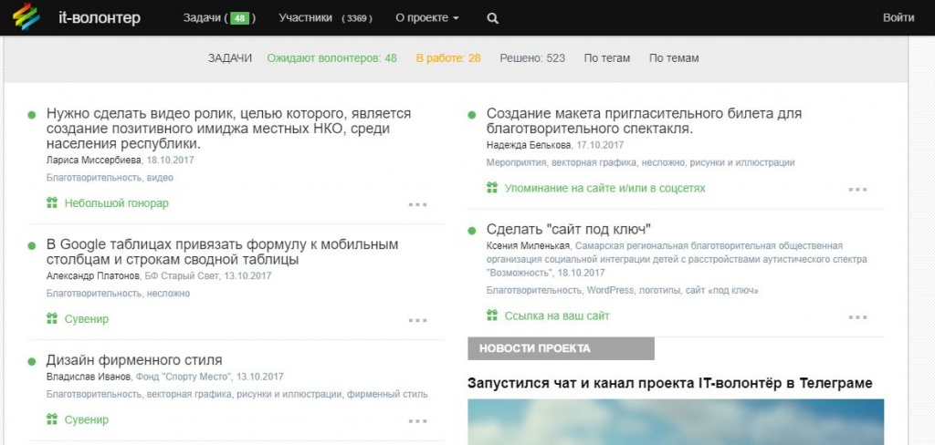 Это онлайн-платформа для обмена задачами по оказанию it-помощи различным НКО. На сайте можно зарегистрироваться и создать задачу, если проекту нужна помощь программиста, дизайнера, журналиста, копирайтера или фоторедактора. Всего на сайте зарегистрировано 3369 участников, из них 342 активных специалиста.
