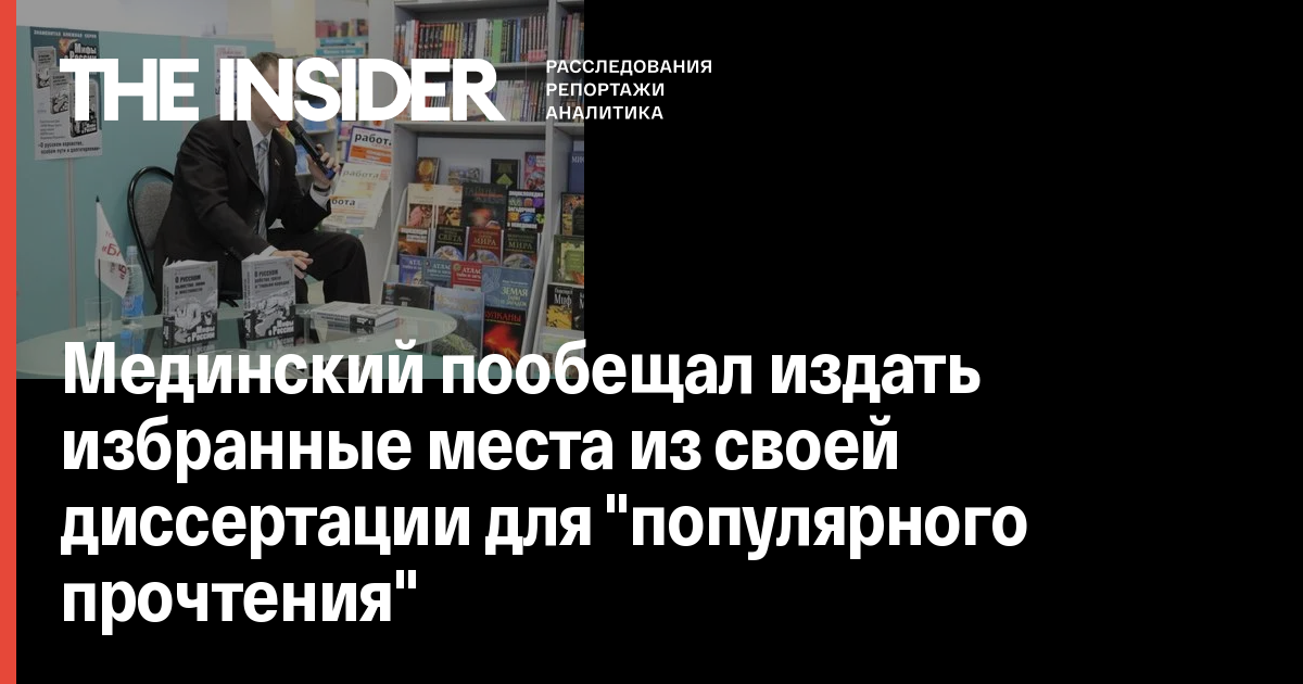 Подробнее об истории с диссертацией Мединского читайте в материалах The Insider: Вилла за среднюю зарплату и автореферат из твиттера. Как «Вести» защищали Мединского и Соловьева и Переобулся на лету. Мединский предъявил автореферат с другими оппонентами. Диссернет: «Это подлог»