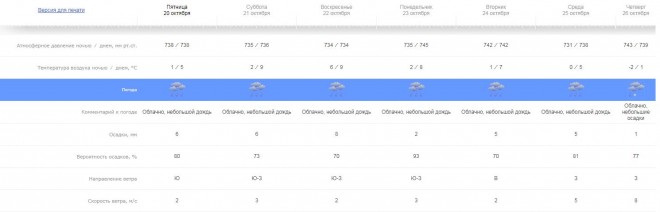 В пятницу, 20 октября, днем ожидается 5°C тепла, ночью – 1°C. Будет небольшой дождь.