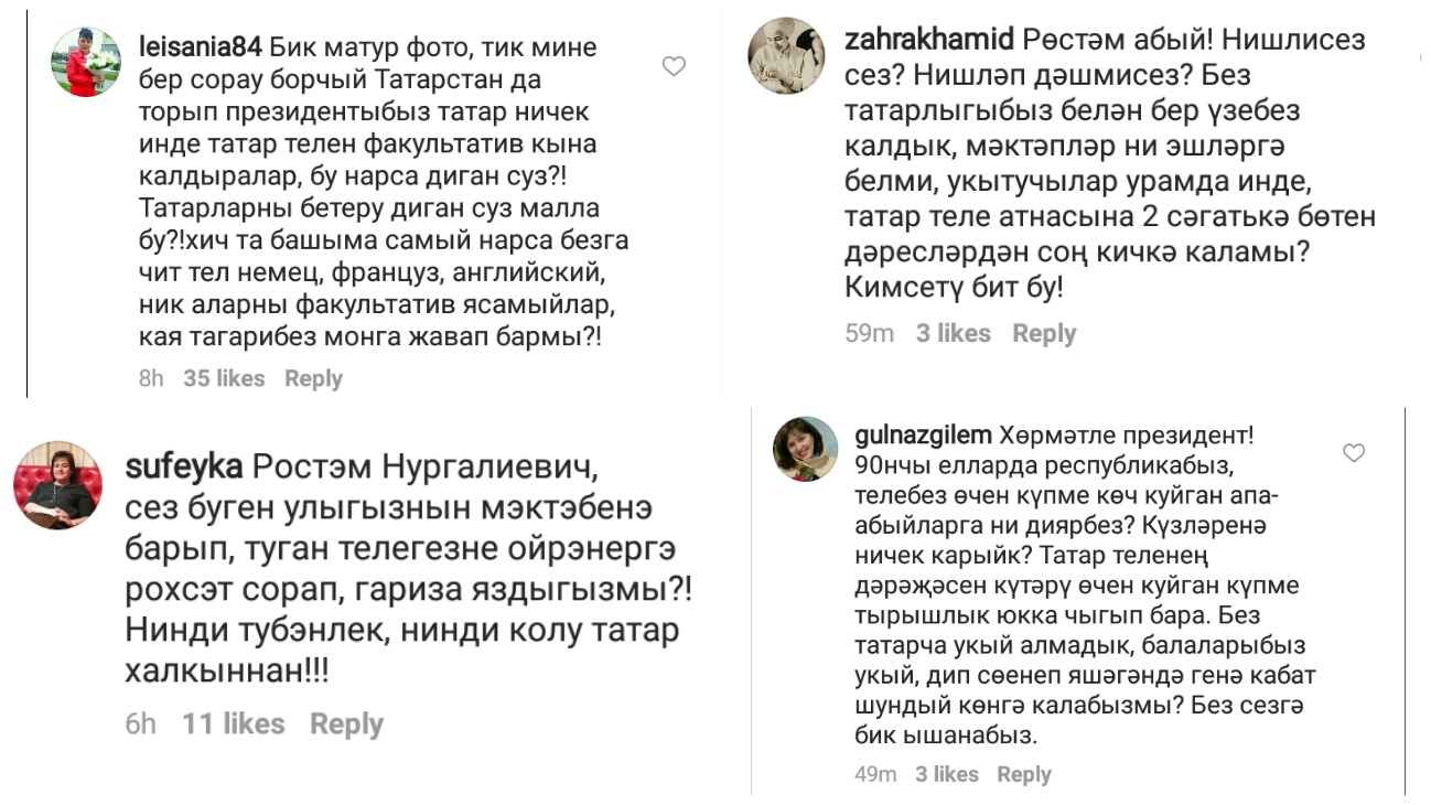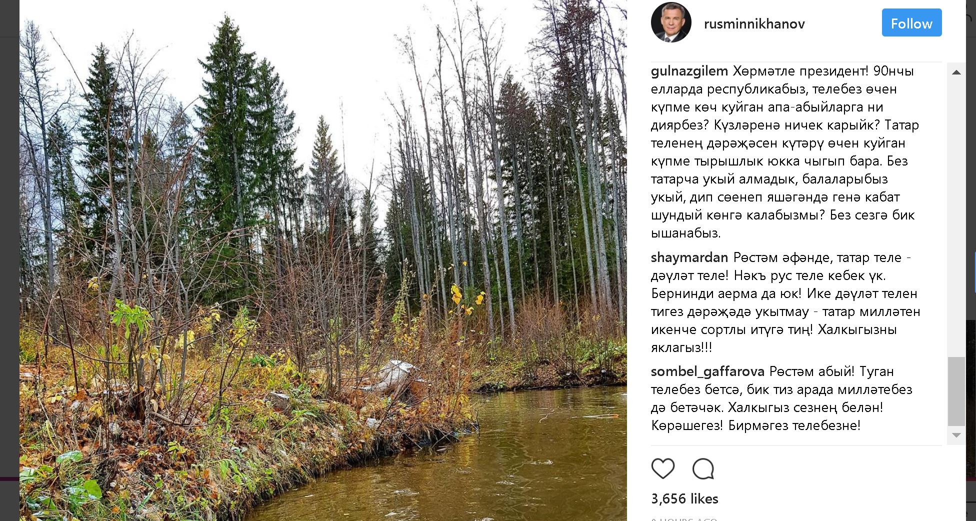 22 октября Минниханов в своем Instagram-аккаунте разместил 8 фото- и один видеопост. Почти под каждым из них многочисленные пользователи оставили комментарии, в которых речь идет о судьбе татарского языка. Например, пользователь leisania84 задает президенту РТ следующий вопрос: "Фото очень красивое, но меня волнует один вопрос: как можно, живя в Татарстане, с татарским президентом, оставить татарский язык факультативом, что это такое? Это уничтожение татар? Куда мы катимся? Ответ будет?!" (перевод с татарского).
