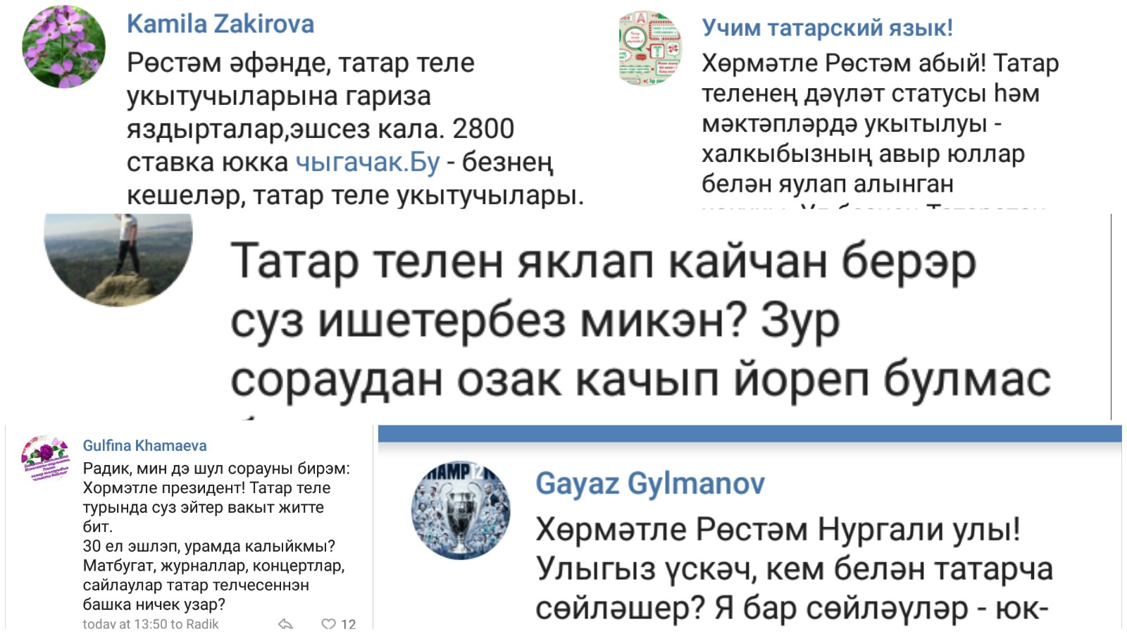 Многих подписчиков Минниханова волнует судьба учителей татарского языка и литературы. Например, в соцсети "ВКонтакте" Камиля Закирова обратилась к президенту Татарстана со следующими словами: "Рустам әфәнде, учителей татарского языка заставляют писать заявления, они остаются без работы. Исчезнет 2800 ставок. Это — наши люди, учителя татарского языка. Если татарский останется факультативом, это будет погребальной песней татарского. Это настоящий геноцид языка". Пользователь также проставила хештеги #остановитеязыковойгеноцид и #stoplanguagegenocide .