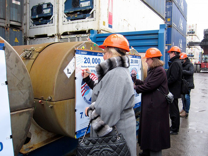 Отгрузка последней партии низкообогащенного урана, произведенного в рамках российско-американского Соглашения ВОУ-НОУ. Представители государственных ведомств РФ и США, а также российских и зарубежных компаний, участвовавших в реализации Соглашения, расписались на контейнерах с ураном. Санкт-Петербург, 14 ноября 2013 года. Фото: nuclear.ru