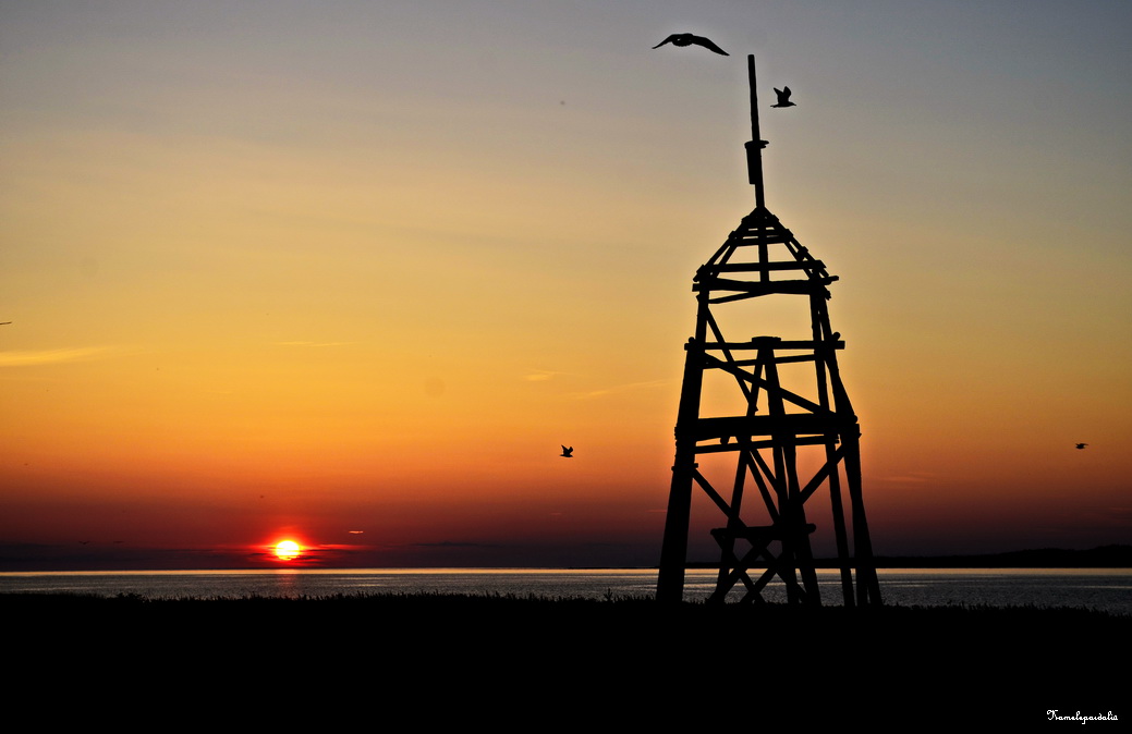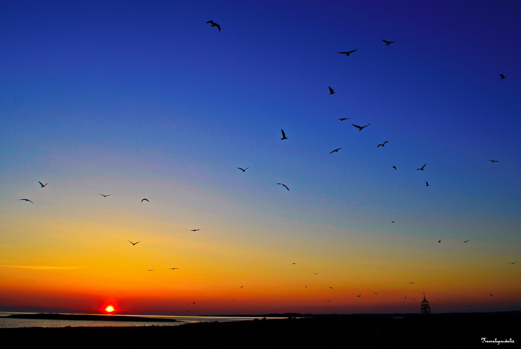 Быстро темнеет и закат мы встречаем на острове.