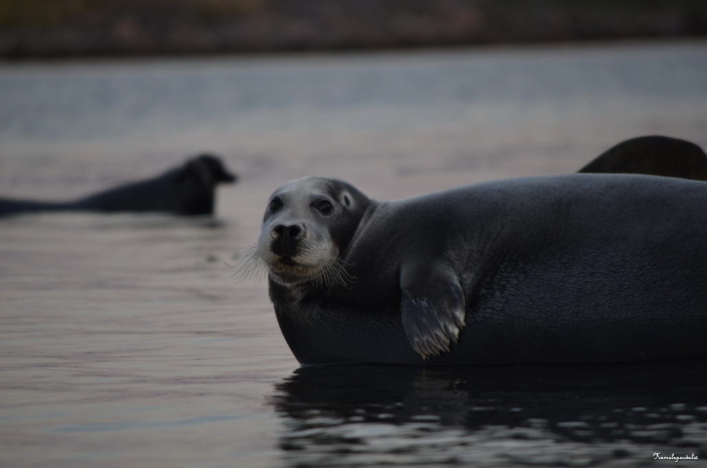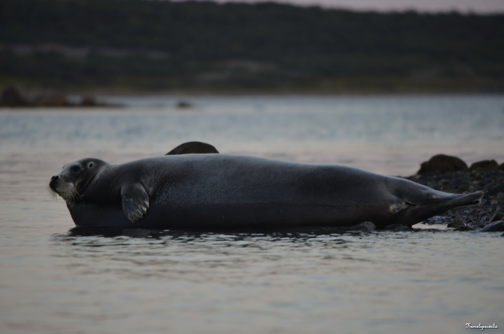На берегу Сеннухи нежатся два морских зайца (лахтака). Сушим весла и подходим совсем близко. Между нами и животными около 15 метров.