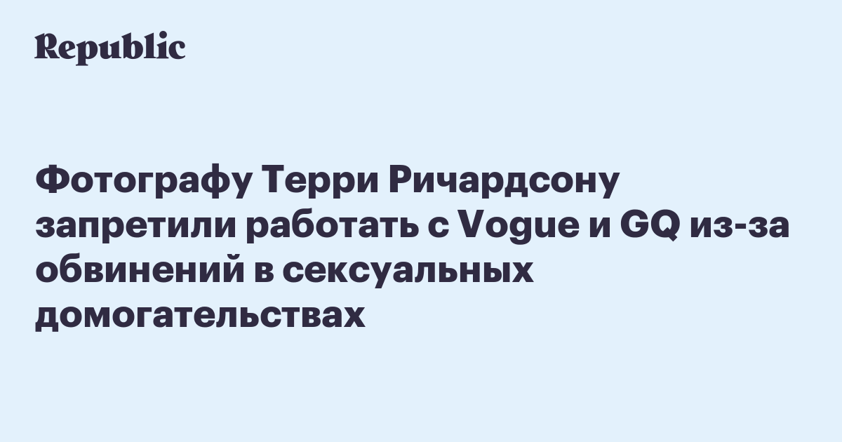 Журналы о моде Vogue, GQ, Glamour и издания Vanity Fair и Wired отказались работать с фотографом Терри Ричардсоном из-за того, что его обвиняли в сексуальных домогательствах. Об этом пишет газета Telegraph со ссылкой на письмо, которые оказались в распоряжении редакции.