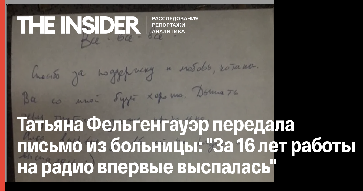 Журналистка «Эха Москвы» Татьяна Фельгенгауэр передала письмо из больницы, в которой она находится после нападения. Его опубликовала ее бывшая коллега Ирина Воробьева.