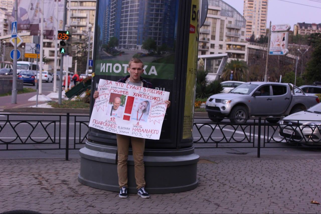 Сегодня в Сочи, возле торгового центра «Александрия», прошёл одиночный пикет в поддержку заключенных в спецприёмник сочинских активистов Константина Гудимова (12 суток за езду на велосипеде с красным шариком) и Олеси Христосенко (8 суток за фотографию на крыльце штаба Навального).