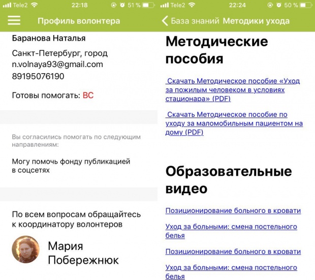 В целом приложение удобное и понятное для пользователя. Его можно скачать не только волонтерам, но и тем, кто хочет иметь под рукой информацию по уходу за больными.