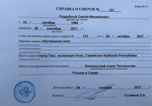 Справка, опубликованная агентством, свидетельствует о смерти 36-летнего жителя Краснодара Сергея Поддубного. В документе говорится, что он погиб 28 сентября в городе Тиас мухафазы Хомс, причина смерти - "обугливание тела". Родственник и один из знакомых Поддубного подтвердили агентству, что погибший воевал в Сирии по частному контракту.