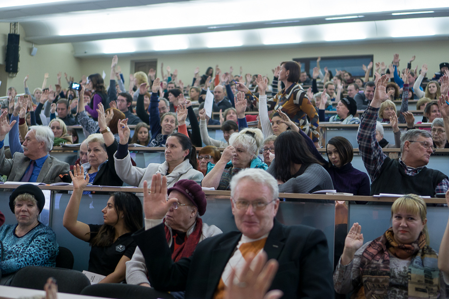 Для голосования на слушаниях зарегистрировались 320 человек. Актовый зал комплекса «Вознесенский» не вместил всех желающих. Для остальных в фойе работала трансляция. В начале мероприятия общественность потребовала включить в счетную комиссию людей из зала, чиновники допустили к подсчетам градозащитницу Елену Богданову.