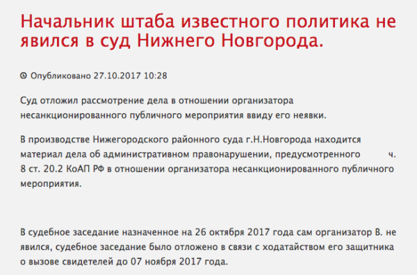 На сайте нижегородского областного суда 27 октября появилось сообщение о том, что глава предвыборного штаба Алексея Навального Леонид Волков не явился на заседание. Заголовок сообщения звучит как «Начальник штаба известного политика не явился на заседание», а в тексте Волкова называют «В.» и организатором несанкционированного публичного мероприятия. В других материалах суд также обходится без имён и названий компаний.